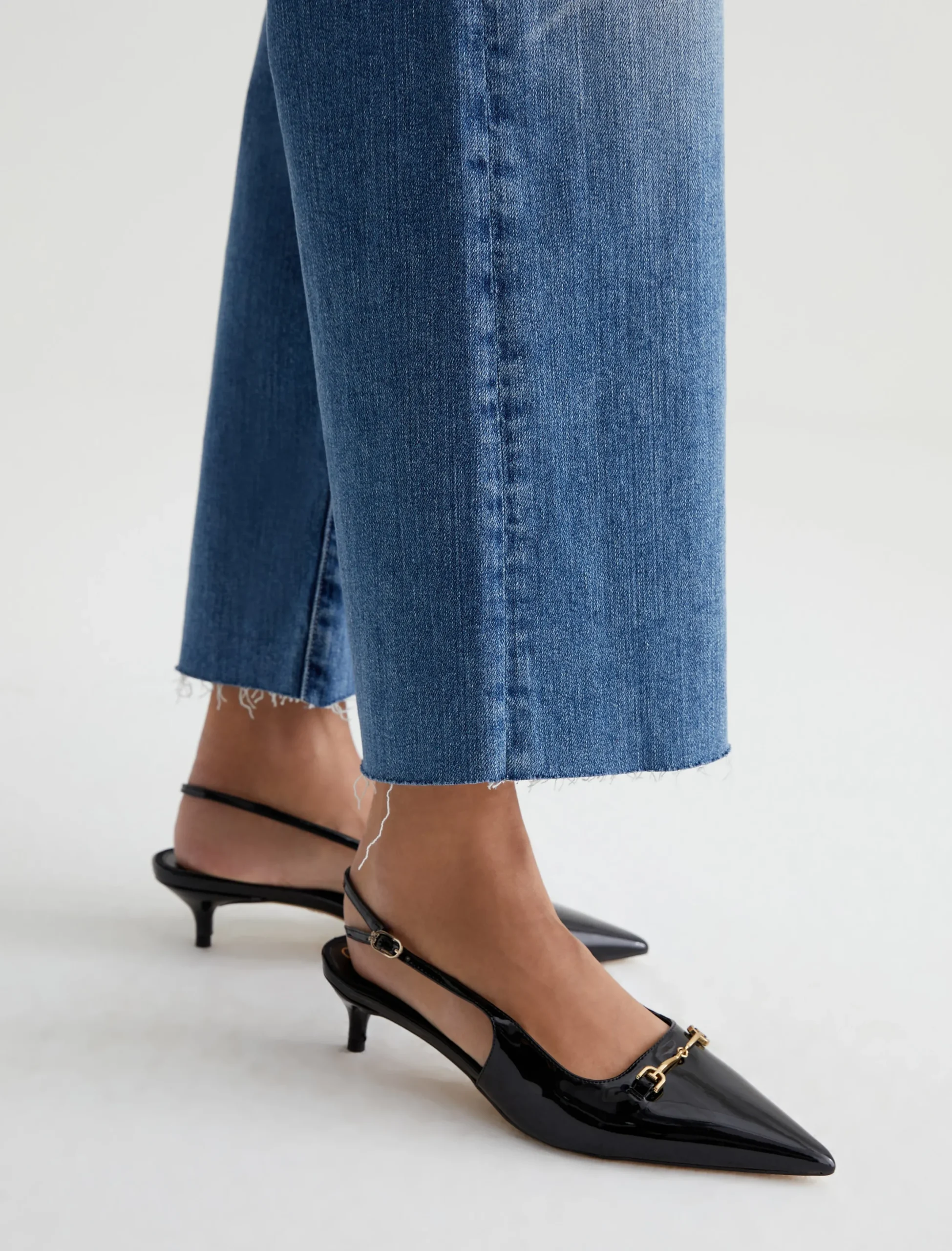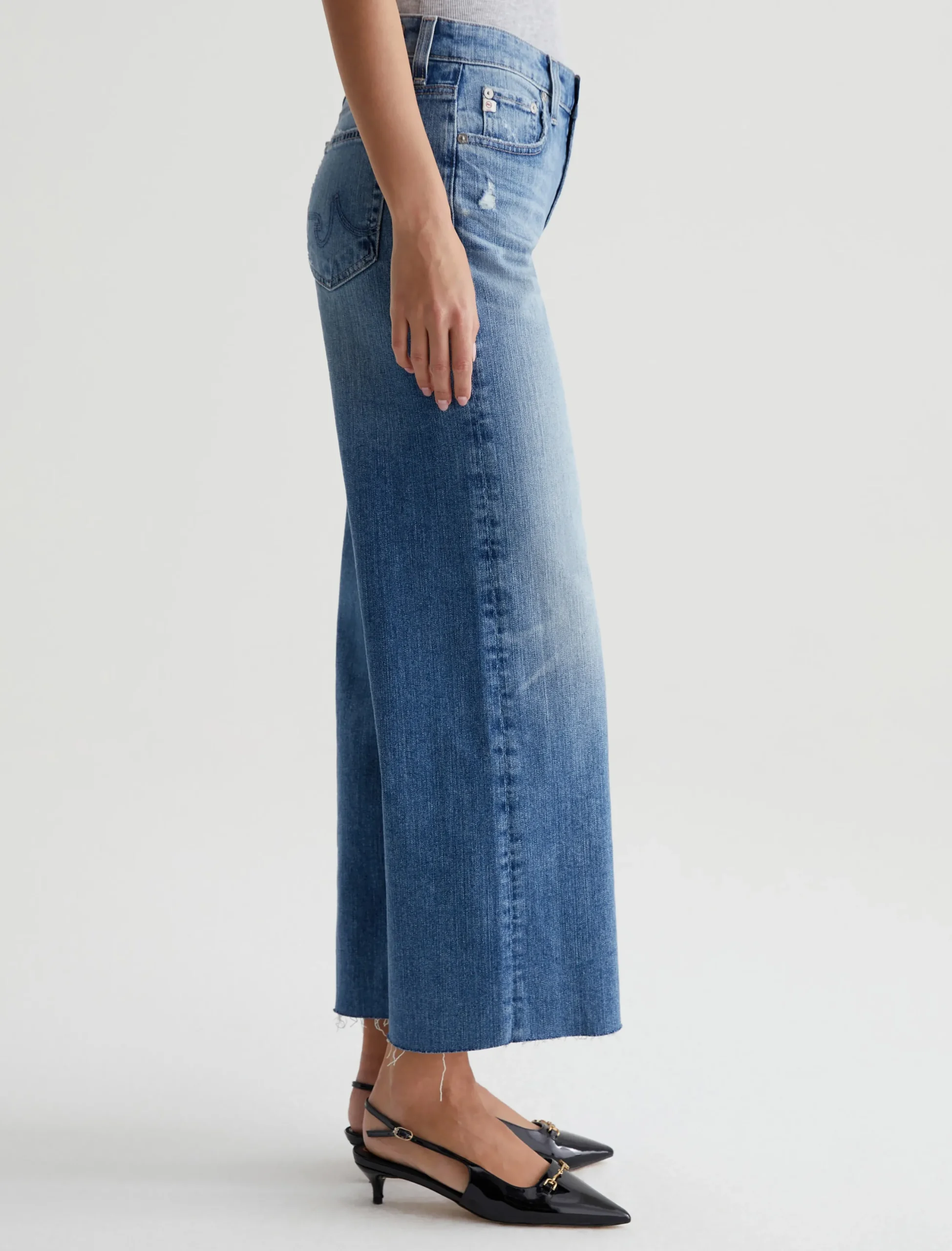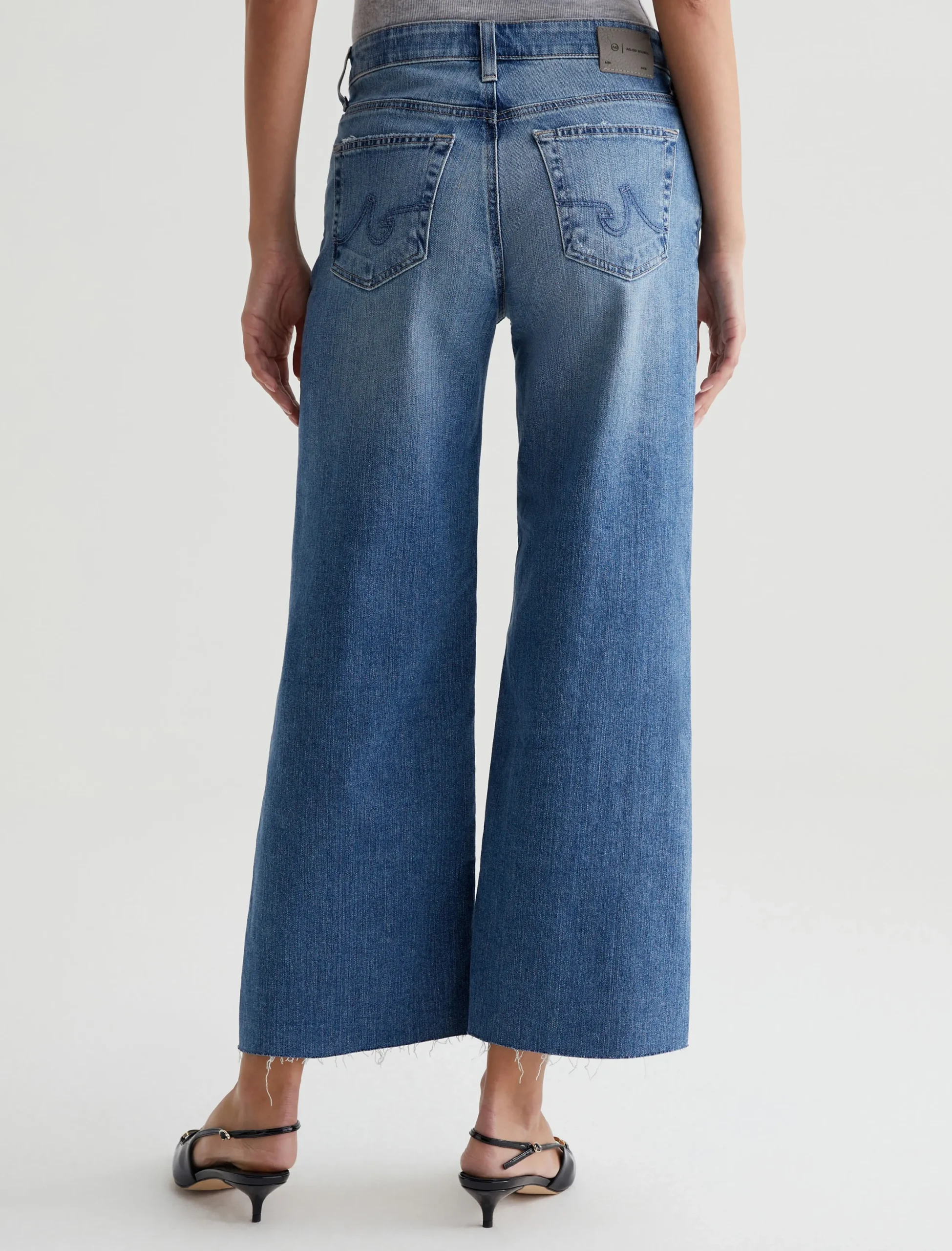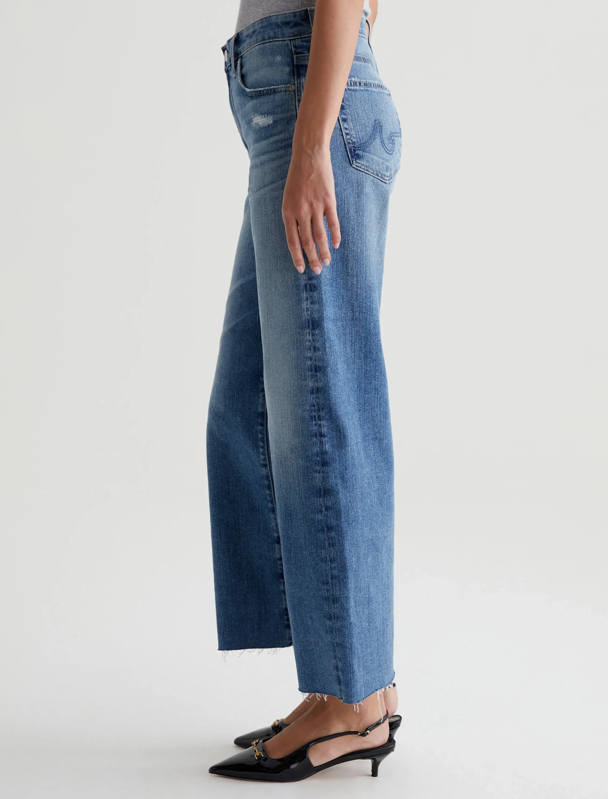 The Saige Wide Leg Crop is a mid-rise jean with loose, cropped legs and raw hems. Made from 11 oz. Lead Denim with comfort stretch, these 5-pocket women’s jeans come in a light indigo wash featuring a 17-year AG-ed™ fade. It’s got whiskering, crease marks, and a bit of distressing at the pockets for a lived-in look.
