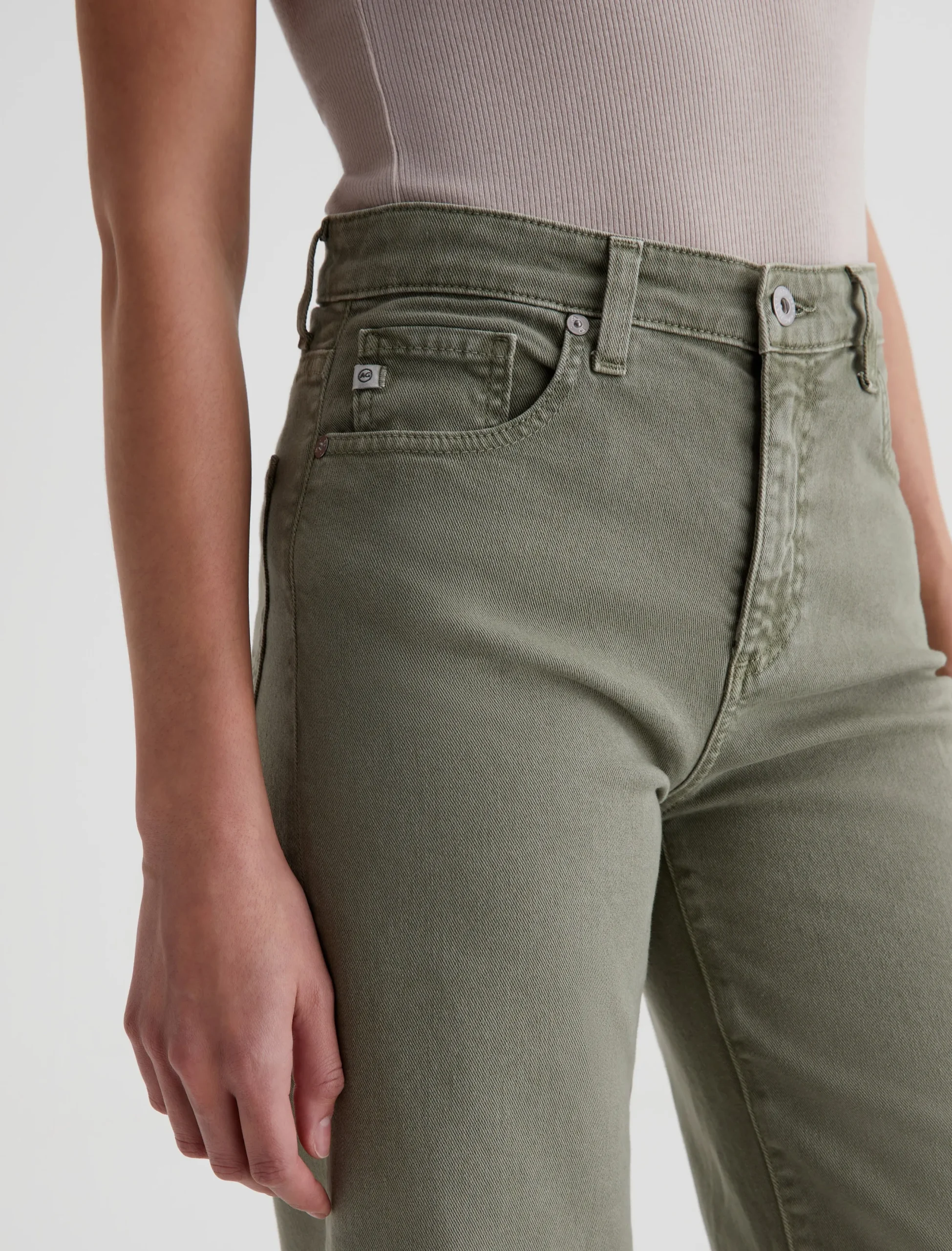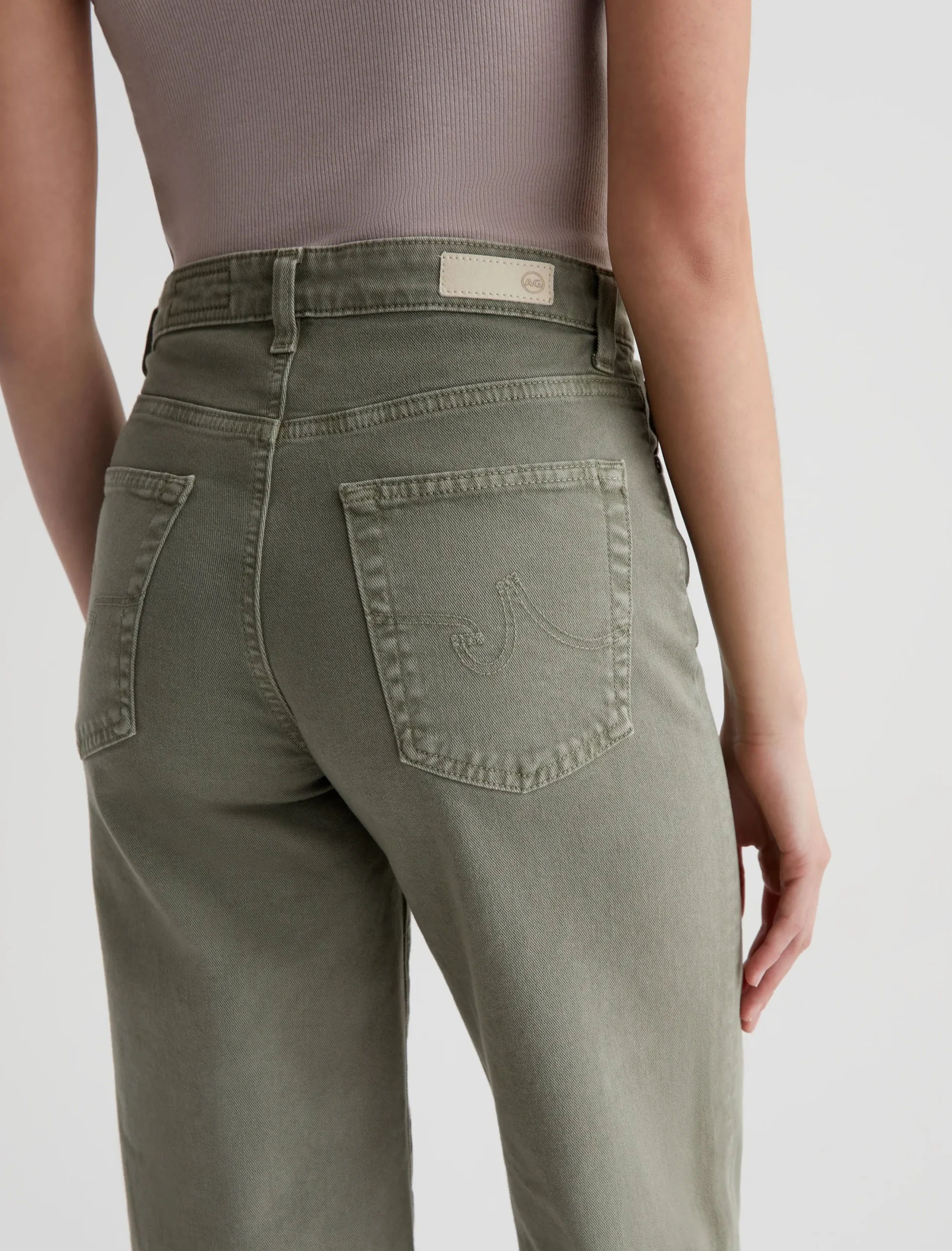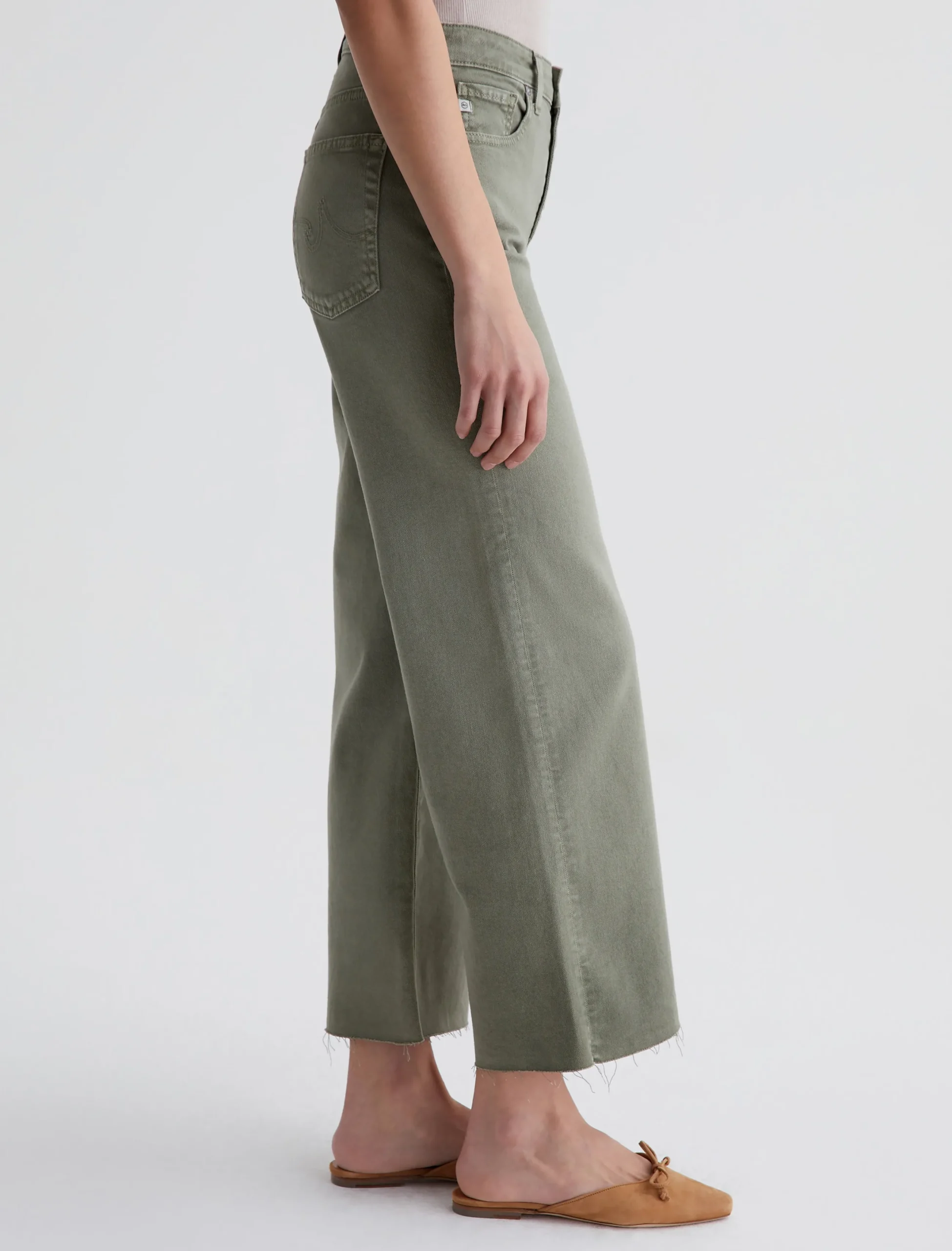 The Saige Wide Leg Crop is a mid-rise jean with loose, cropped legs and raw hems. This 5-pocket pair features our 8.7 oz. Hyper-Soft Bull Denim in a faded olive green shade. AG Cloud Soft Denim™ fabrics have a special left-hand twill construction, allowing the yarns to gently relax and untwist for a supple feel that gets softer with every wear. Dual-elastic stretch offers extra comfort and a resilient shape.