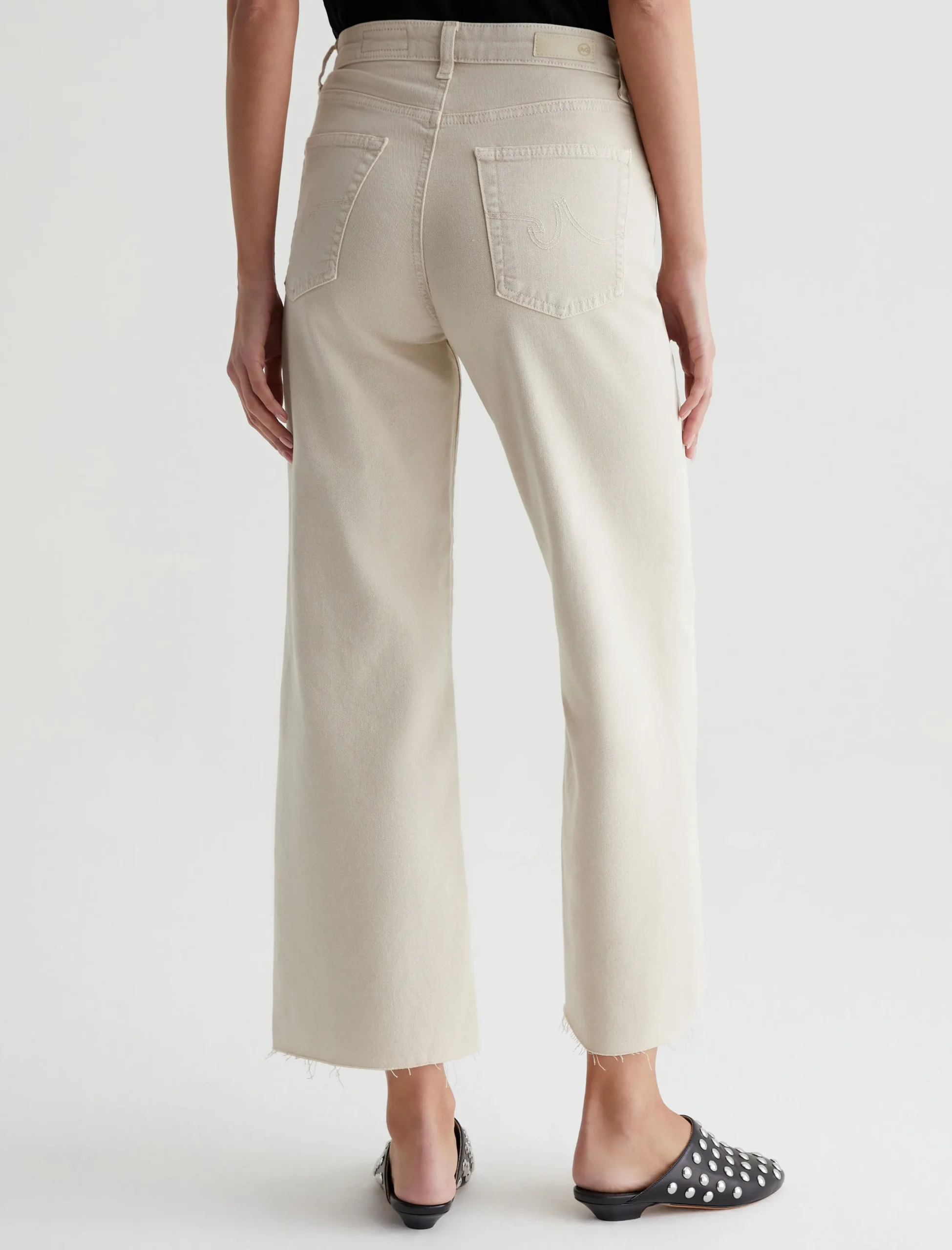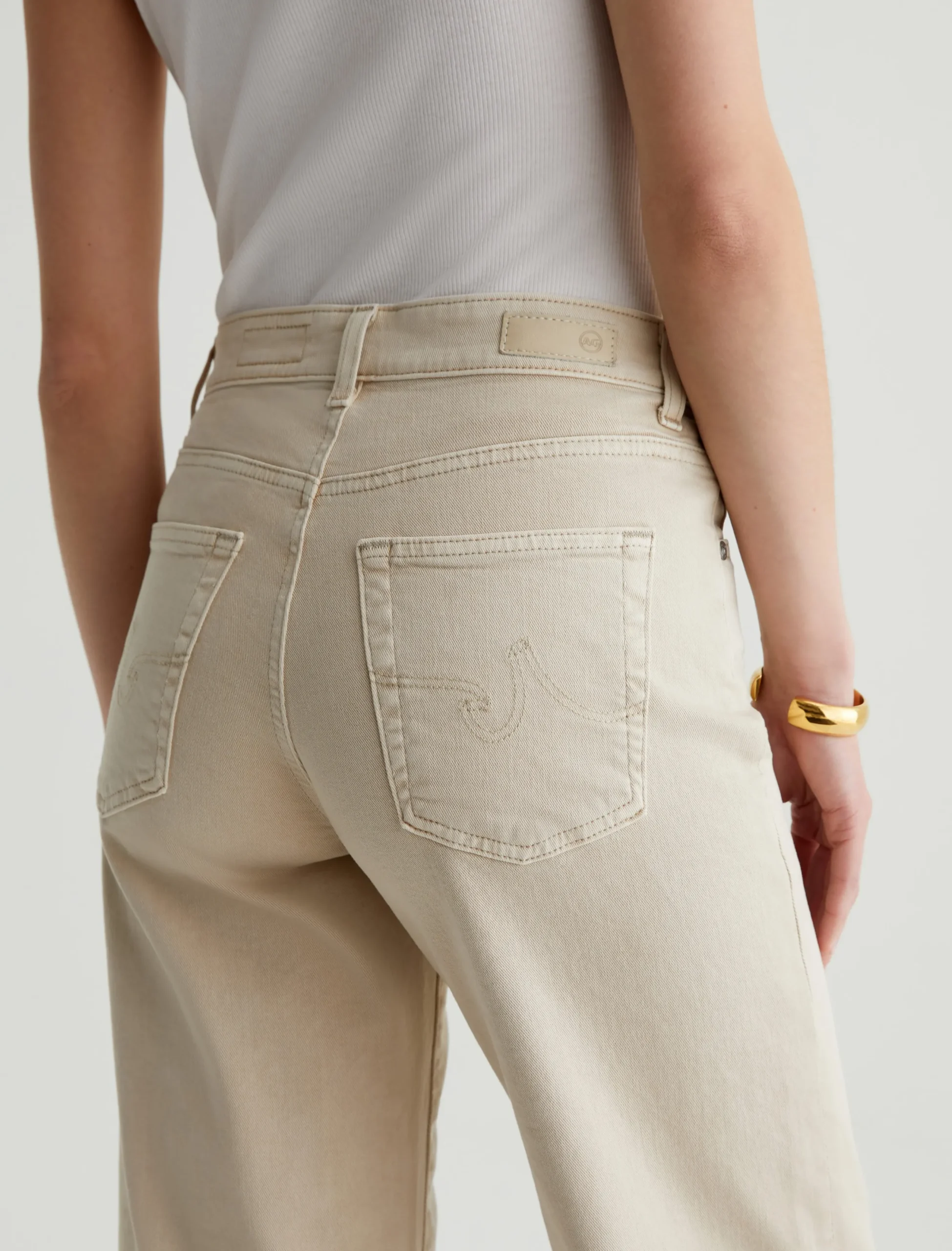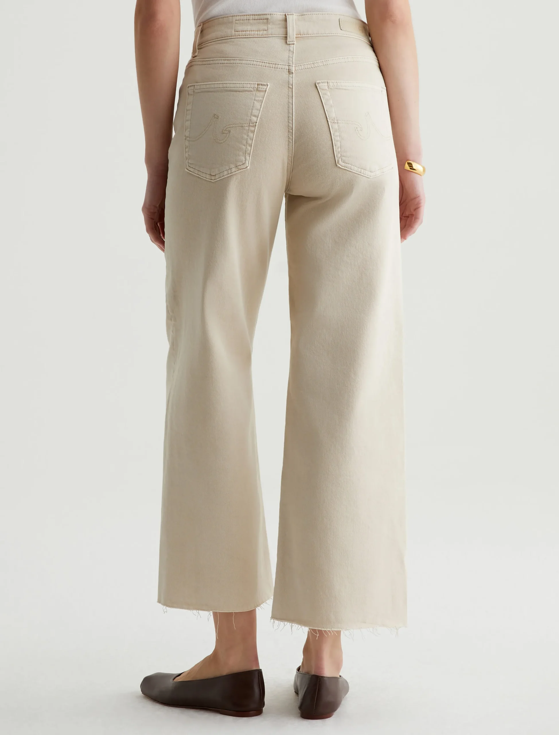 The Saige Wide Leg Crop is a mid-rise jean with loose, cropped legs and raw hems. This 5-pocket pair features our 8.7 oz. Hyper-Soft Bull Denim in a sulfur-dyed pale beige shade. AG Cloud Soft Denim™ fabrics have a special left-hand twill construction, allowing the yarns to gently relax and untwist for a supple feel that gets softer with every wear. Dual-elastic stretch offers extra comfort and a resilient shape.