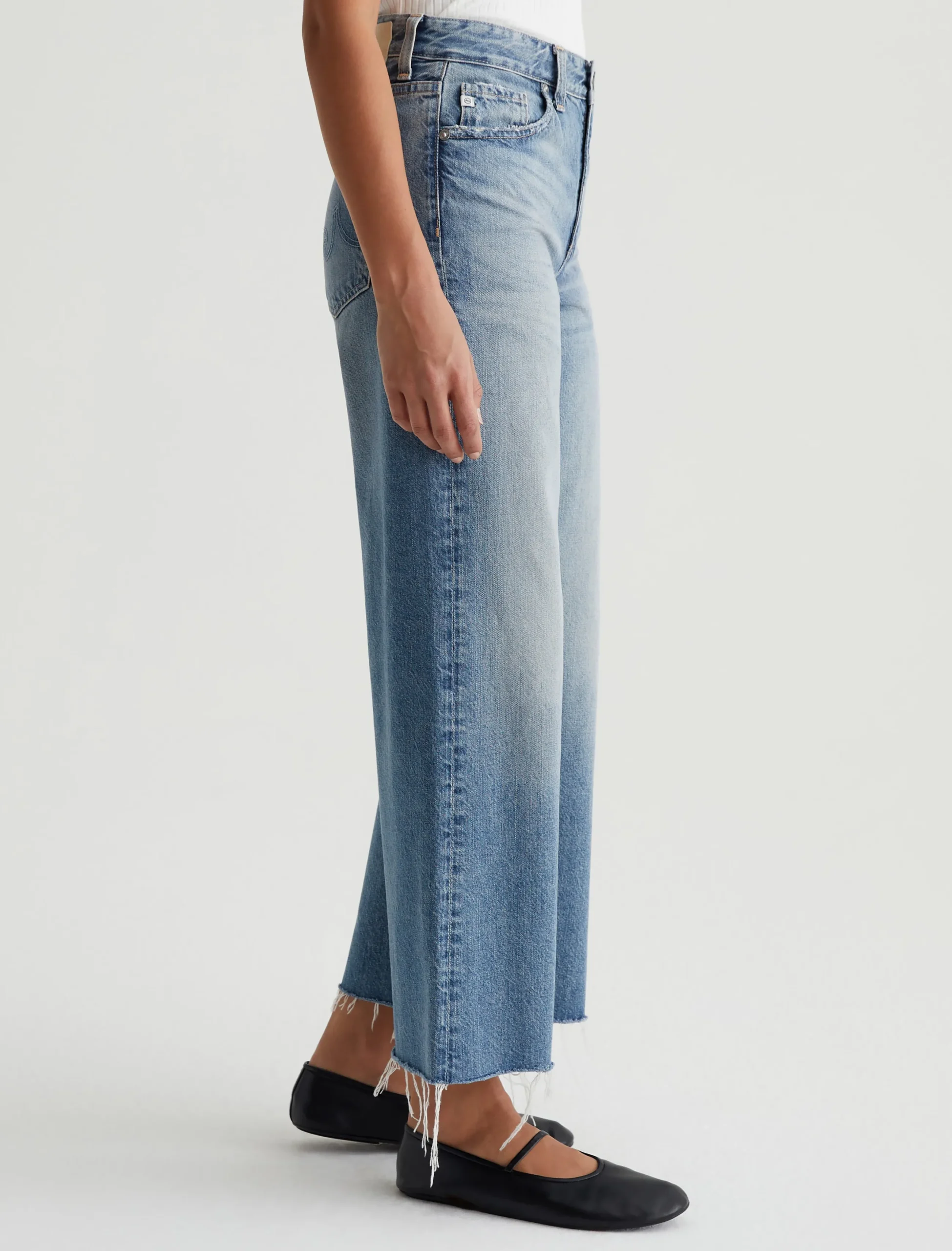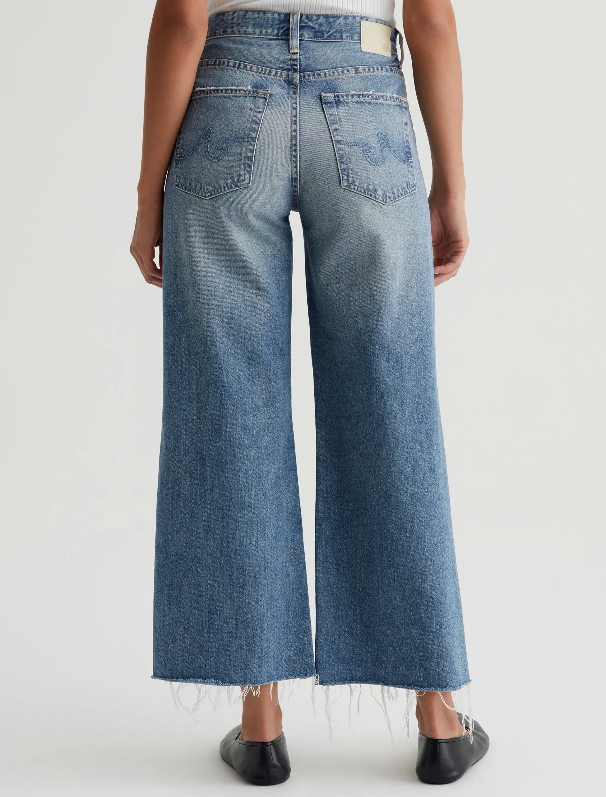 Our Saige Wide Leg Crop features a mid-rise waist and loose, cropped legs with softly frayed raw hems. It’s crafted from rigid 11.75 oz. Legion Denim in a light blue wash with heavy fading.