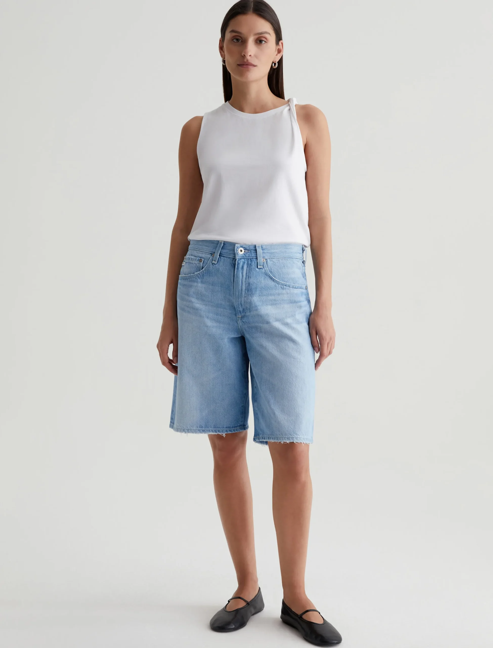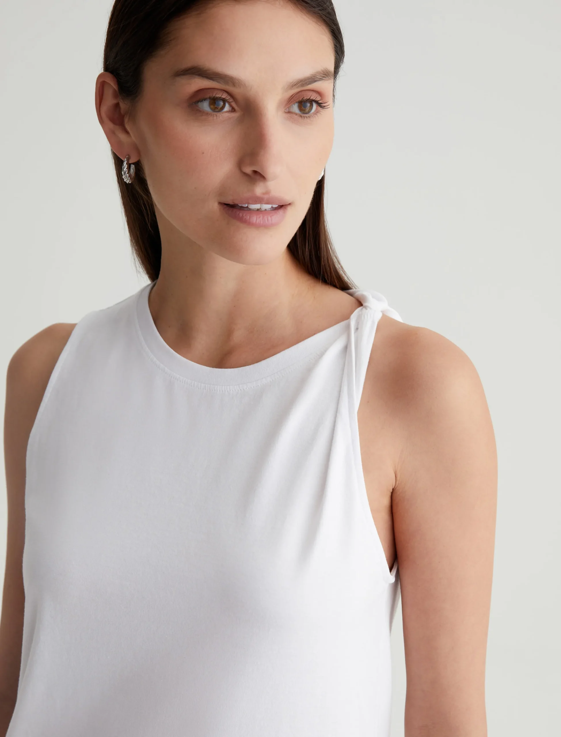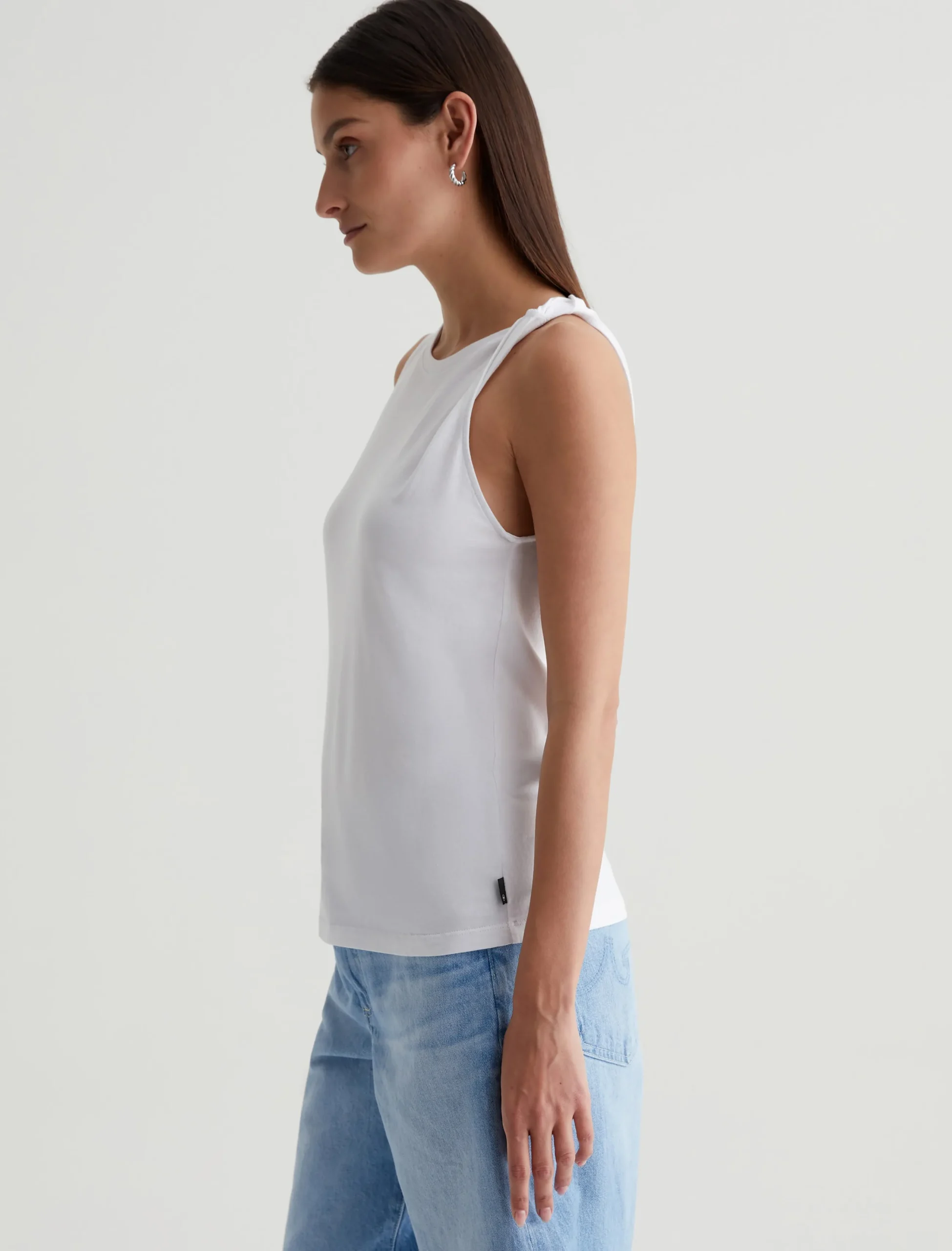 The Sato Tank’s asymmetrical twist detail on the left shoulder lends a novel approach to the classic muscle tee. Done in fresh white, it’s made from stretch-blend Luxe Comfort Jersey for a soft, easy feel.