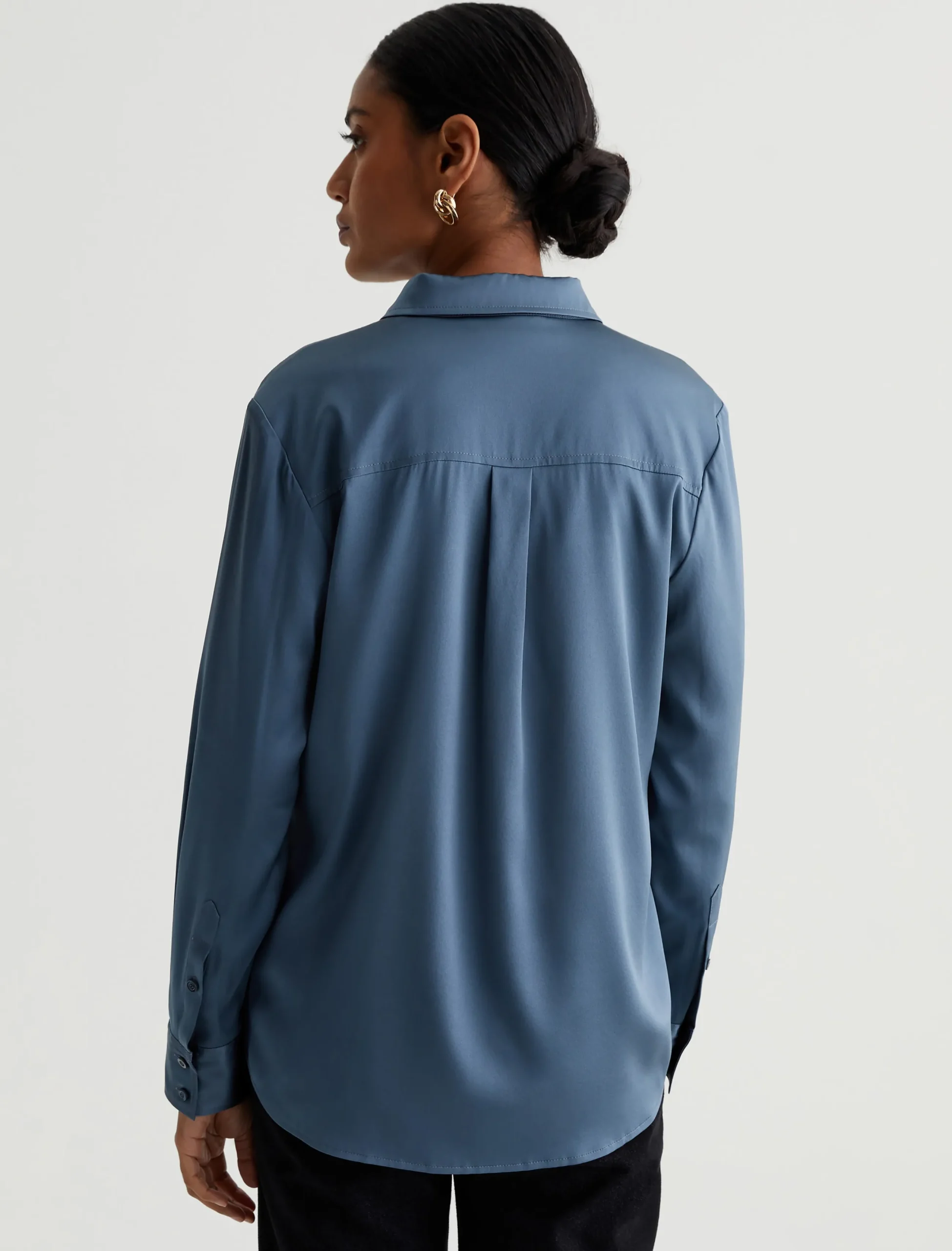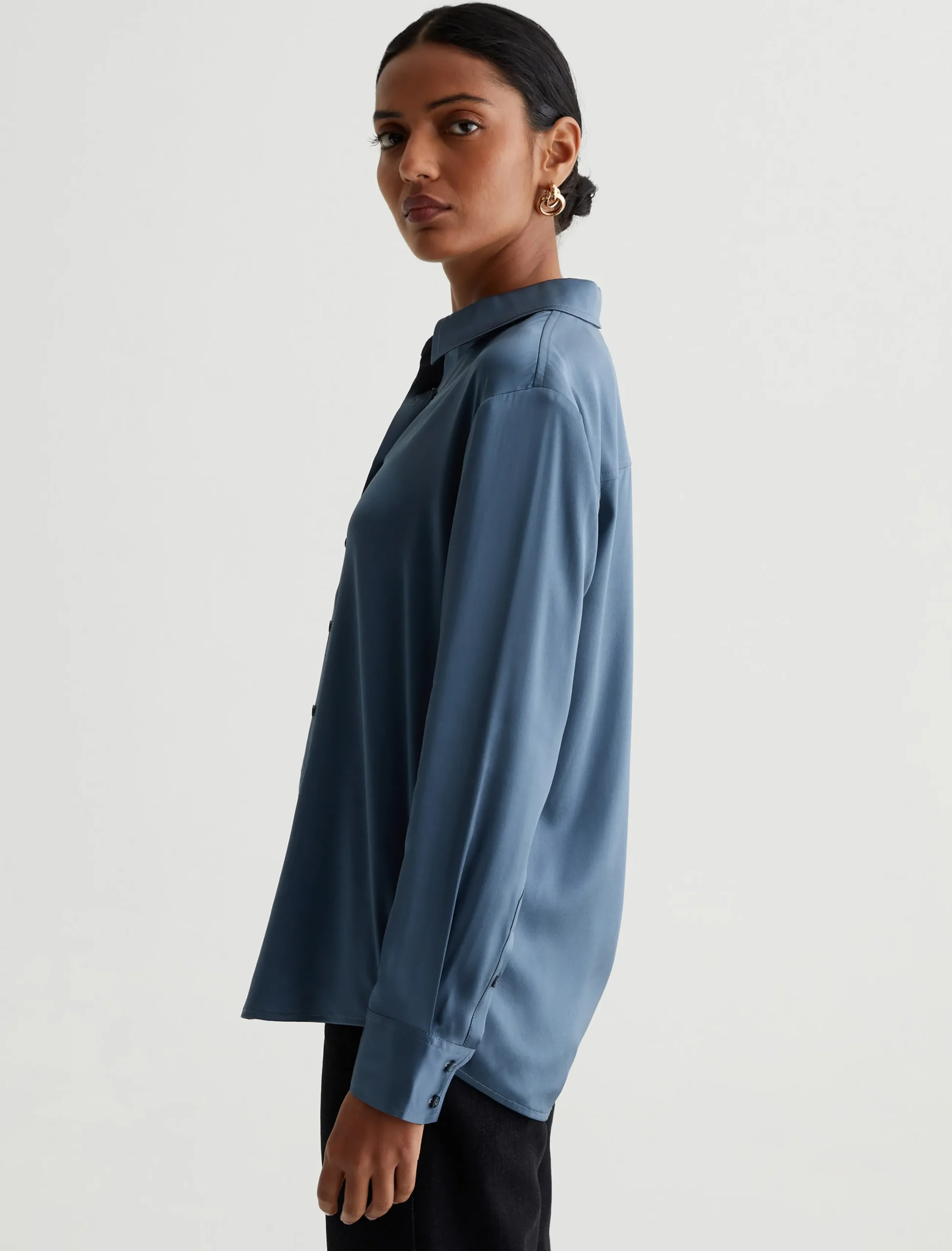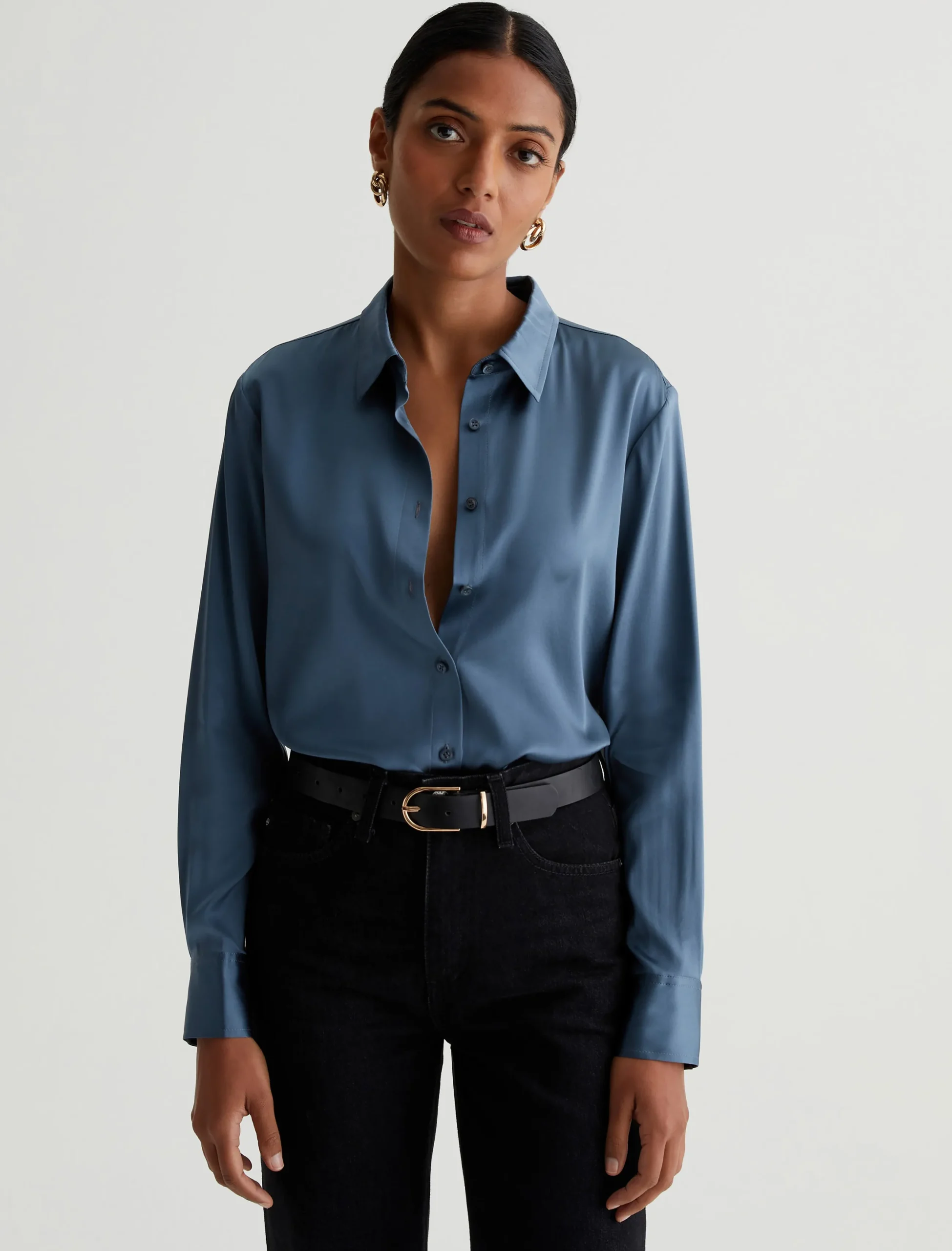 The Shiela button-up shirt is an AG favorite elevated by luxurious stretch silk in blue. The long-sleeve style has a classic fit with pointed collar and an exposed button placket. An easy piece to dress up or wear with jeans for a more casual look.