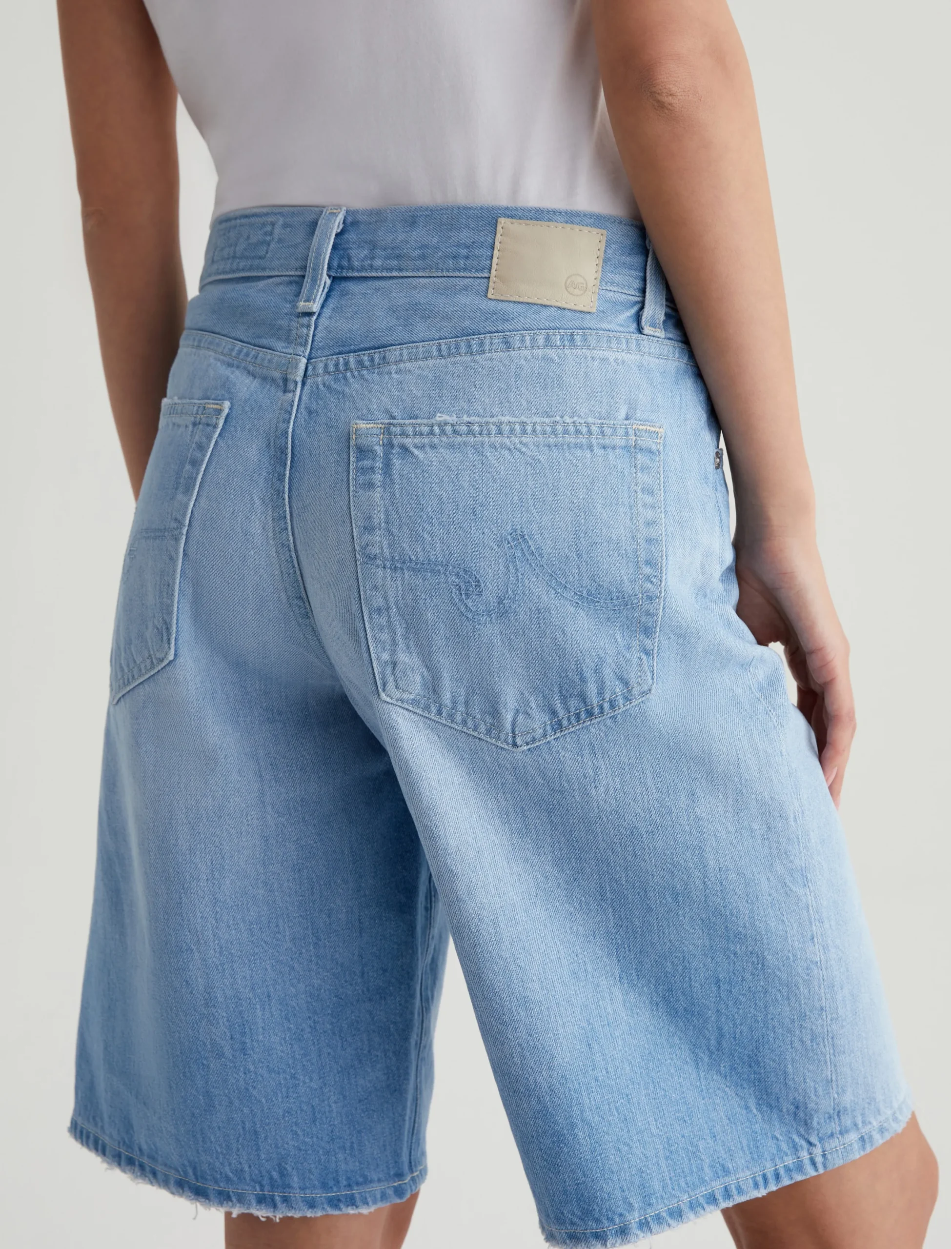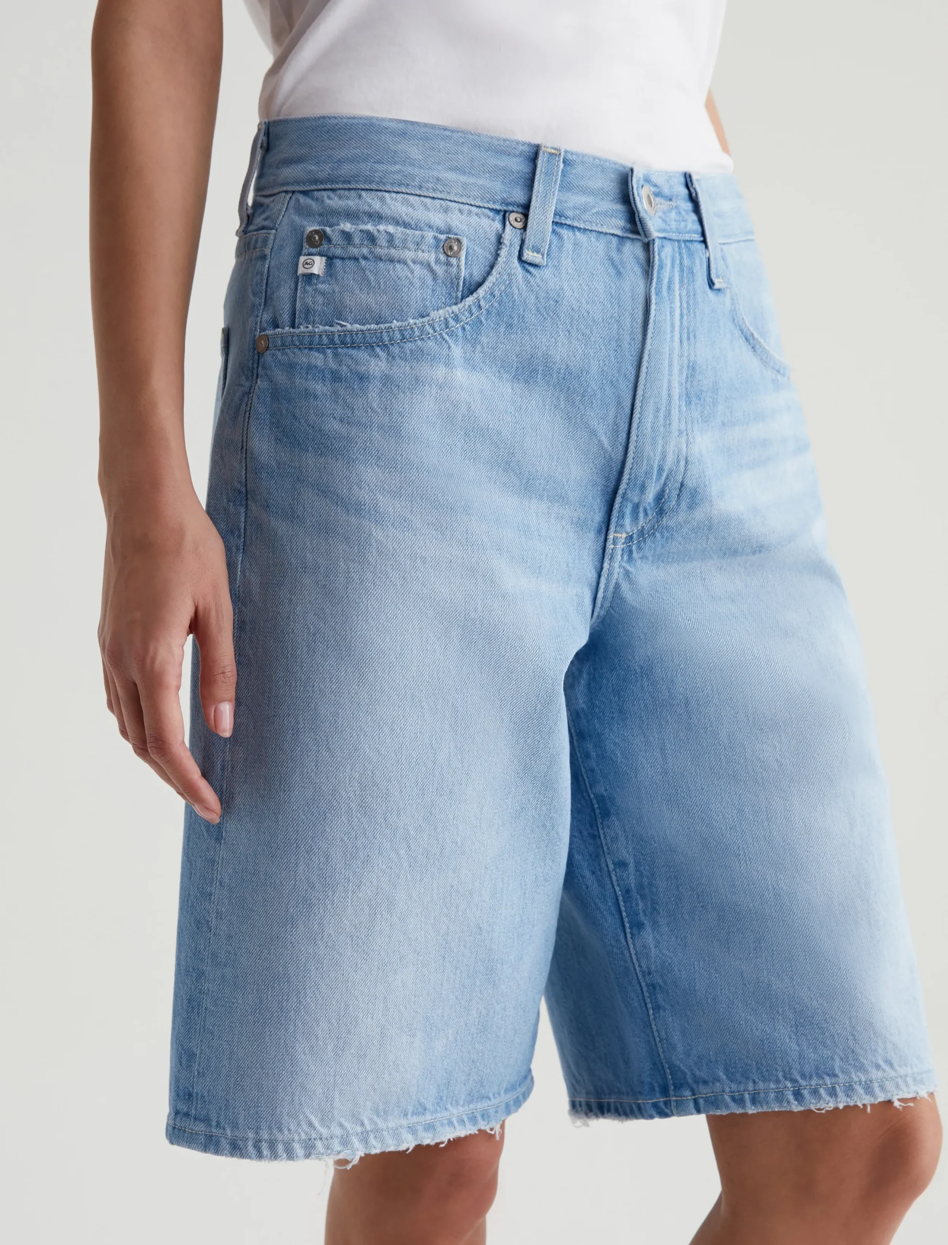 Our Thalia wide-leg bermuda shorts have a low-slung waist and a slouchy fit. Cut from 13 oz. Sioux Rigid Denim in 100% cotton, this five-pocket style features a light indigo wash with faded whiskers and gently worn edges.