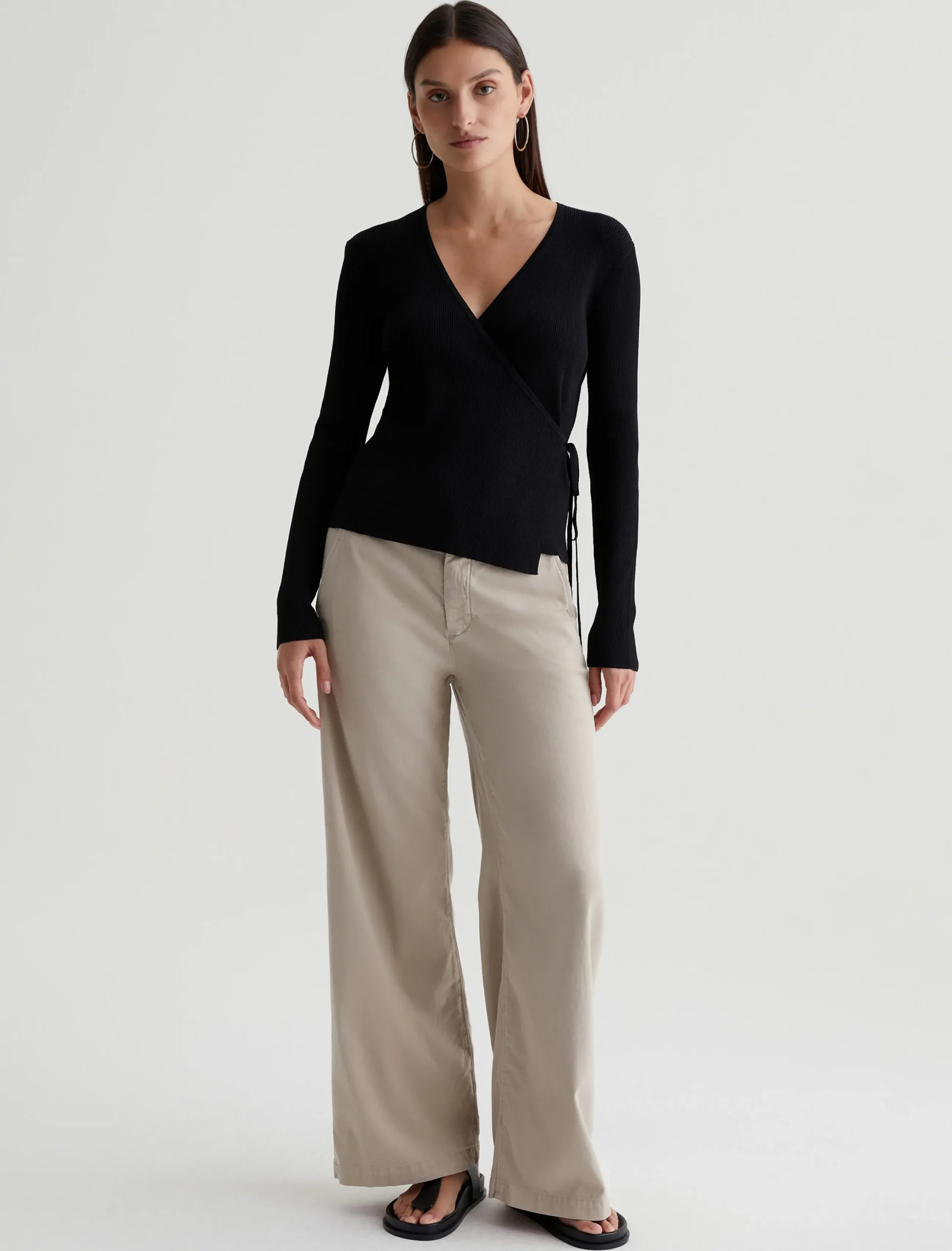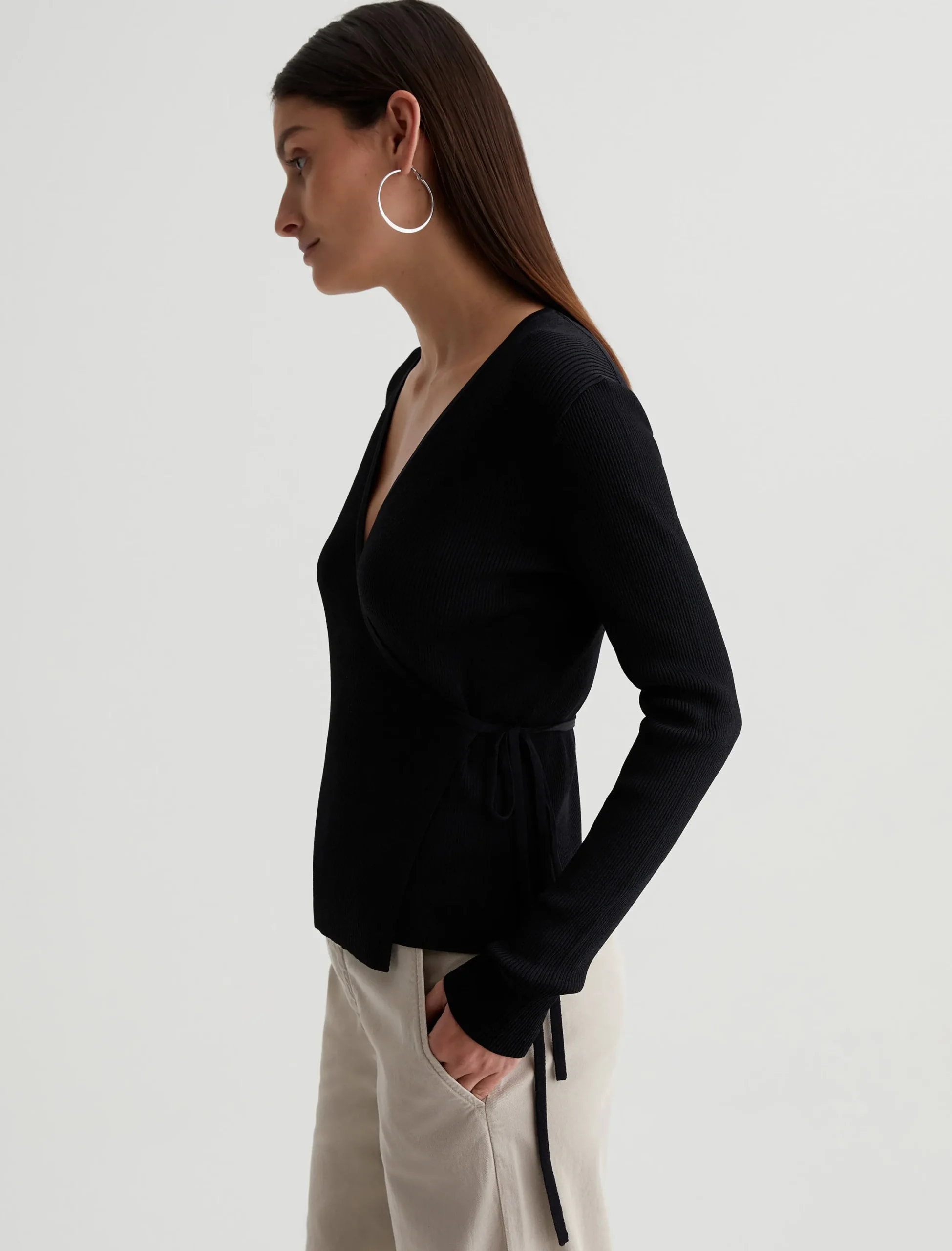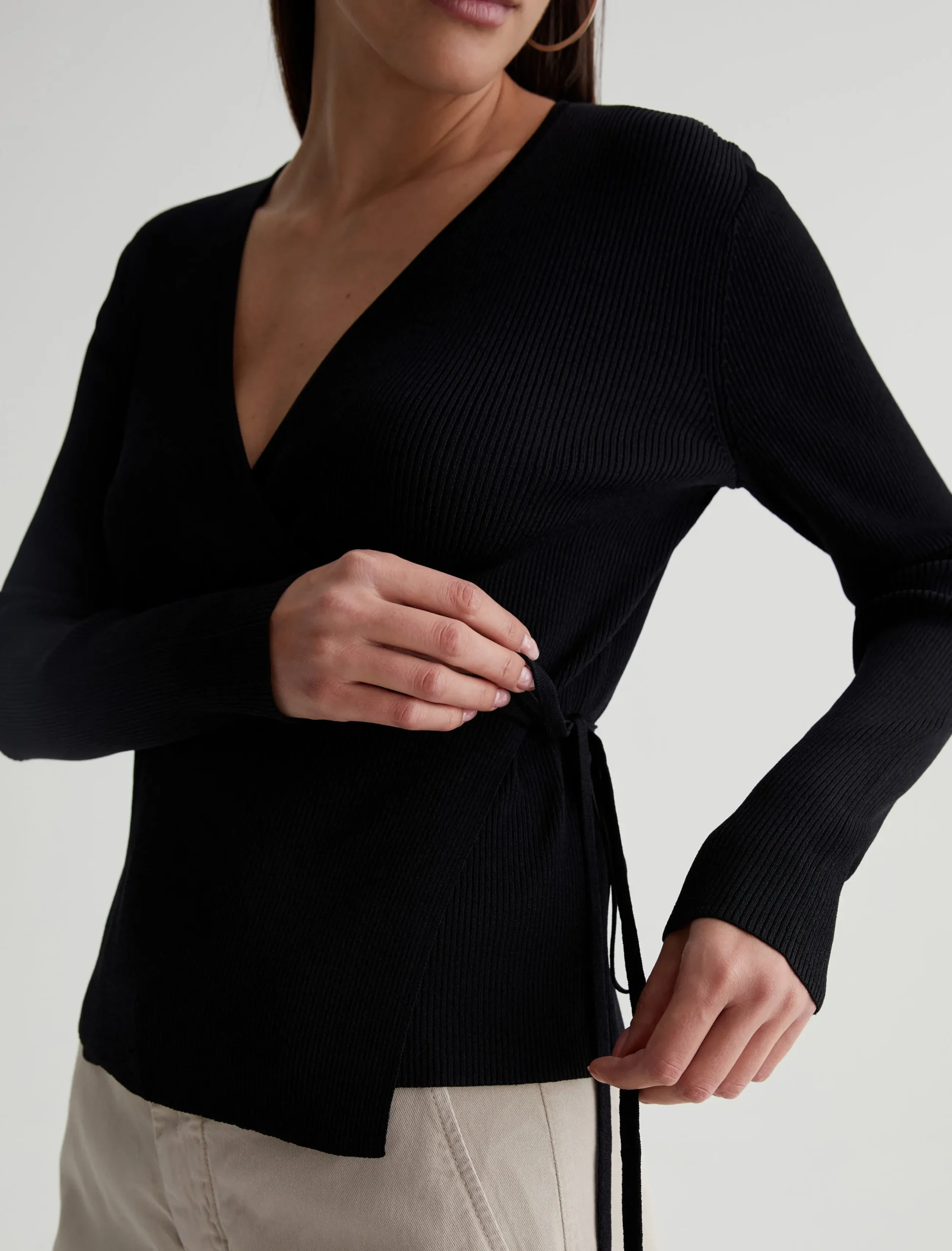 The Yukiko classic-fit wrap sweater in black boasts a slightly cropped silhouette enriched with a ribbed texture. The long-sleeve style is detailed with a customizable tie waist, allowing you to personalize the fit.