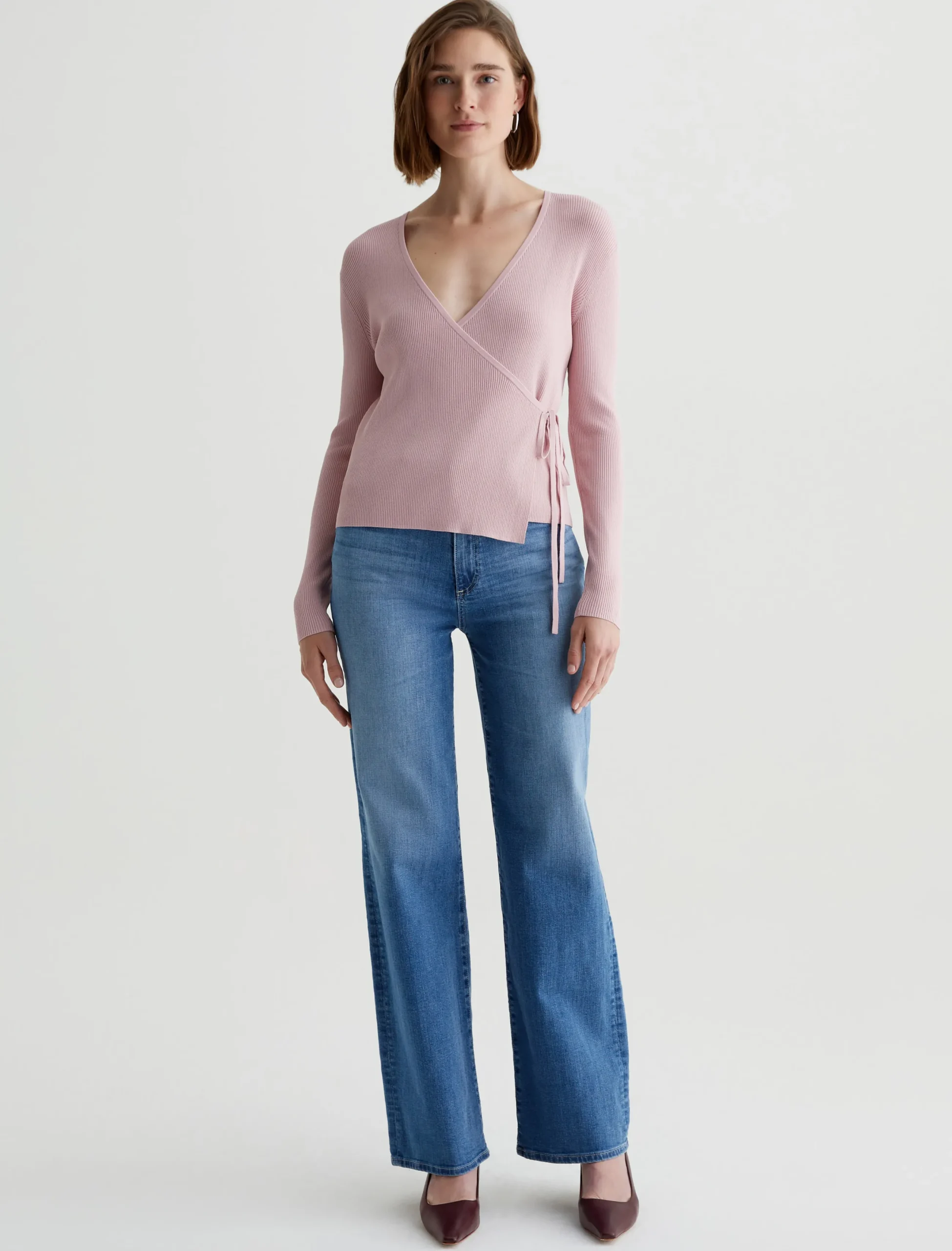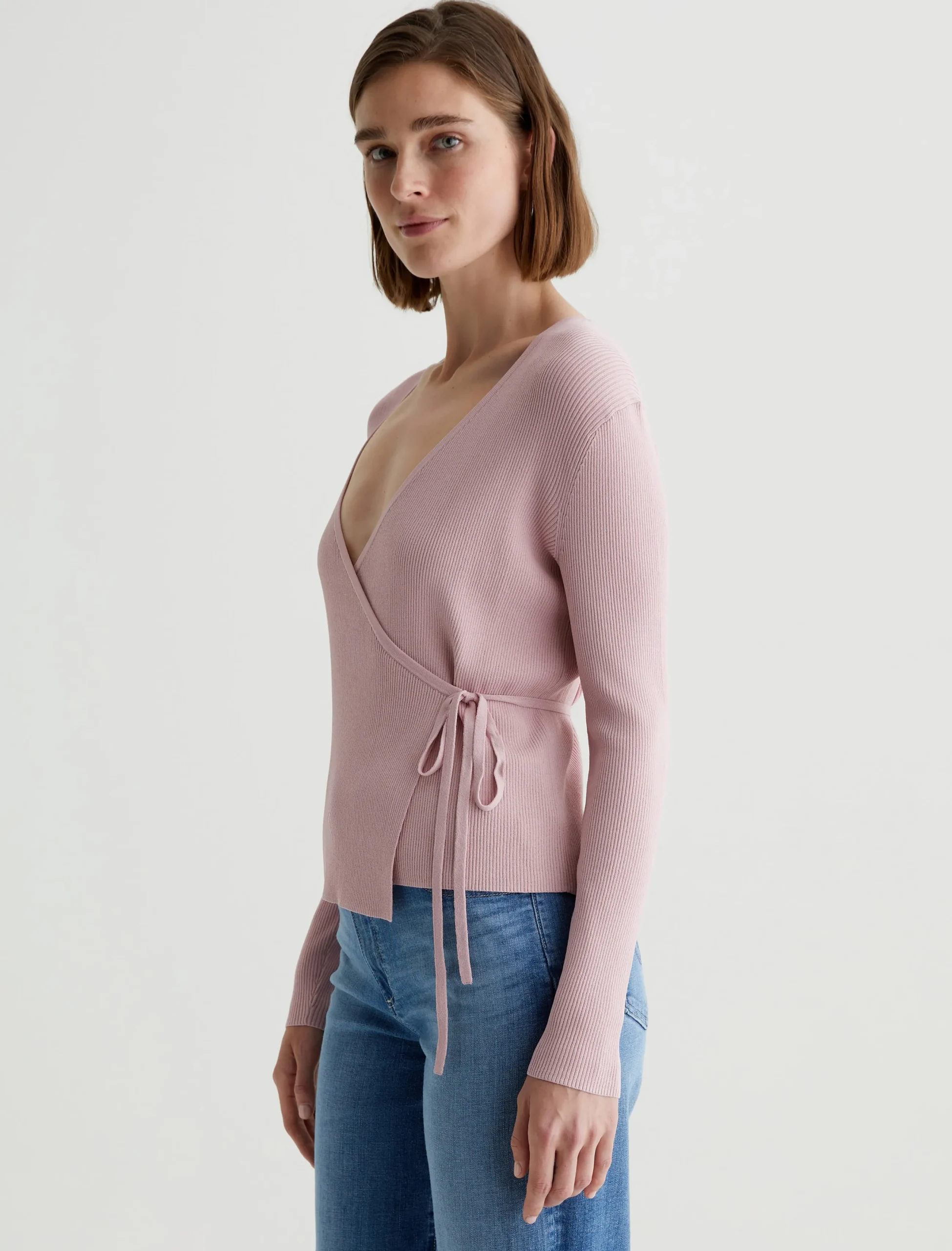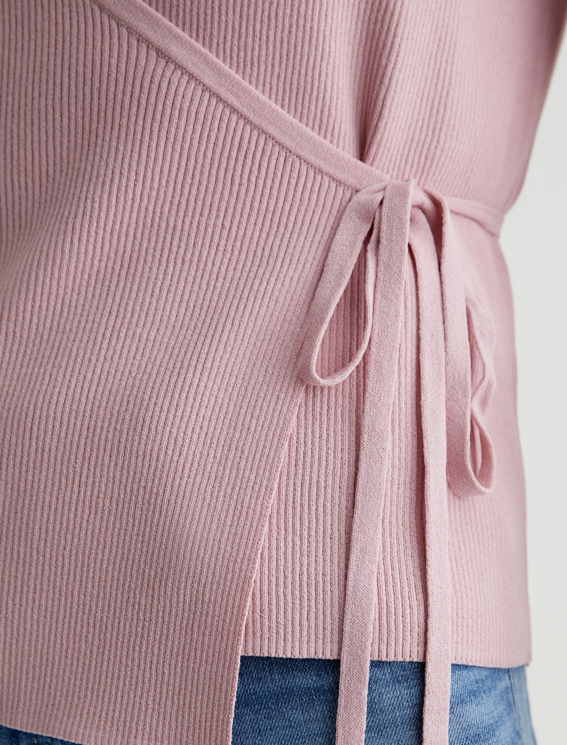 The Yukiko classic-fit wrap sweater in pale pink boasts a slightly cropped silhouette enriched with a ribbed texture. The long-sleeve style is detailed with a customizable tie waist, allowing you to personalize the fit.