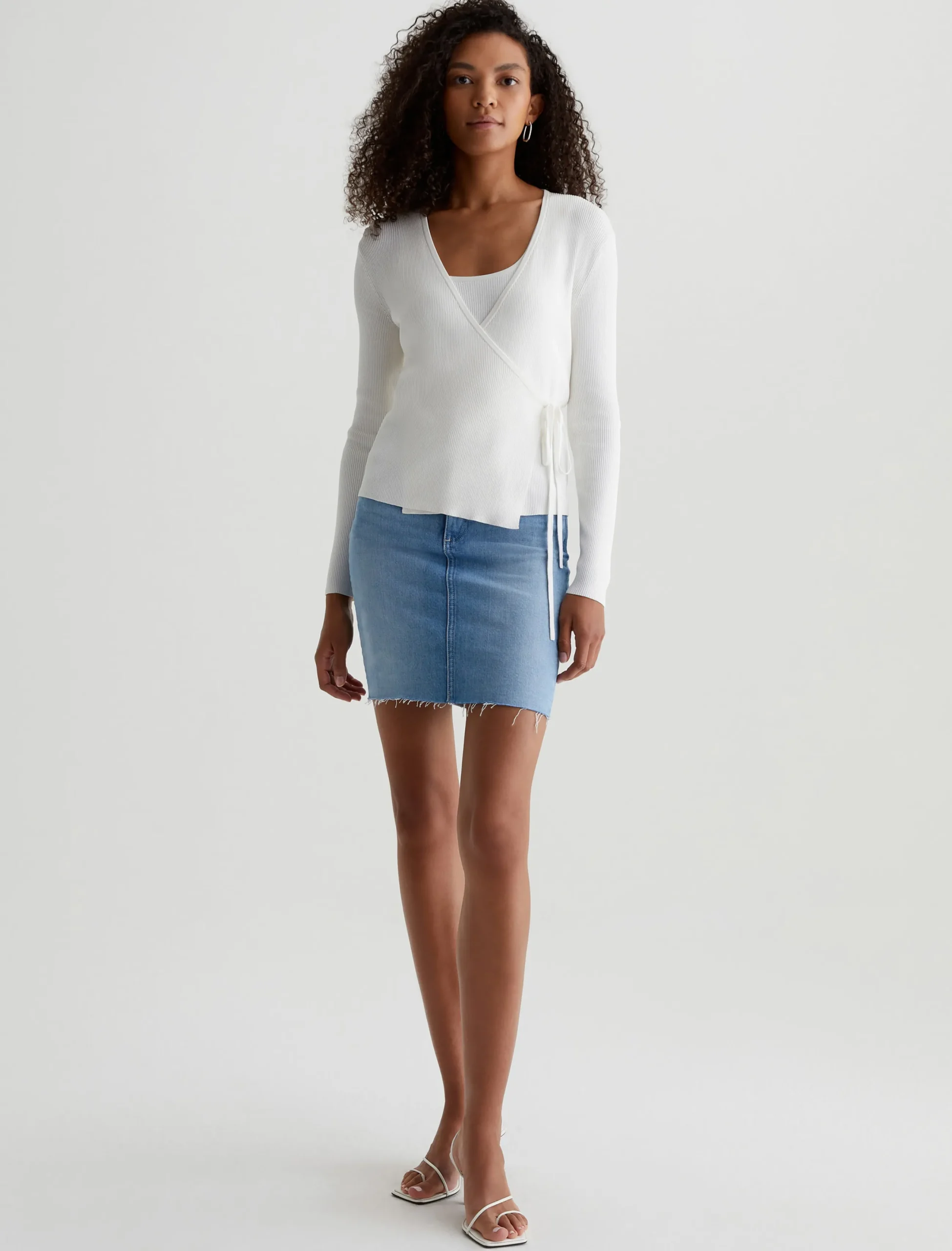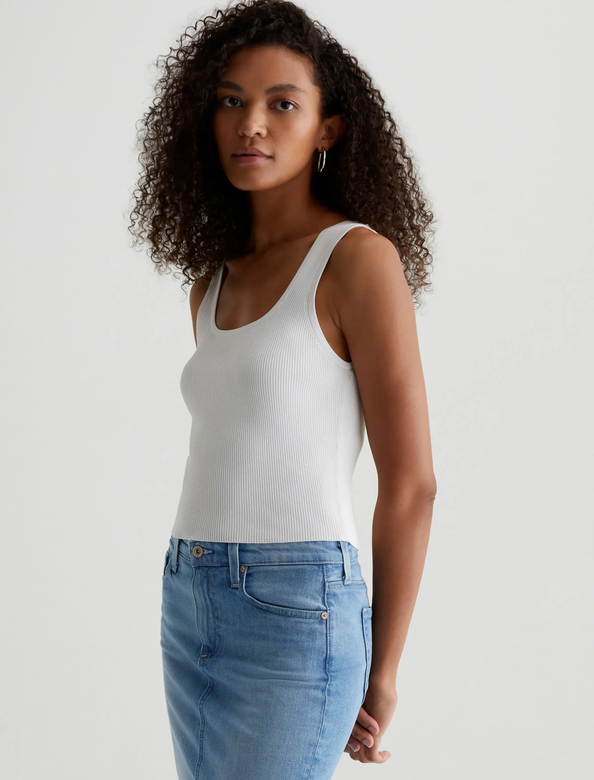 The Yuri fitted tank embodies chic sophistication, offering a sleek, formfitting design in a shorter length that grazes the upper hip. Defined by a flattering scoop neckline, it’s crafted from ribbed Luxe Loom Viscose fabric in powder white.